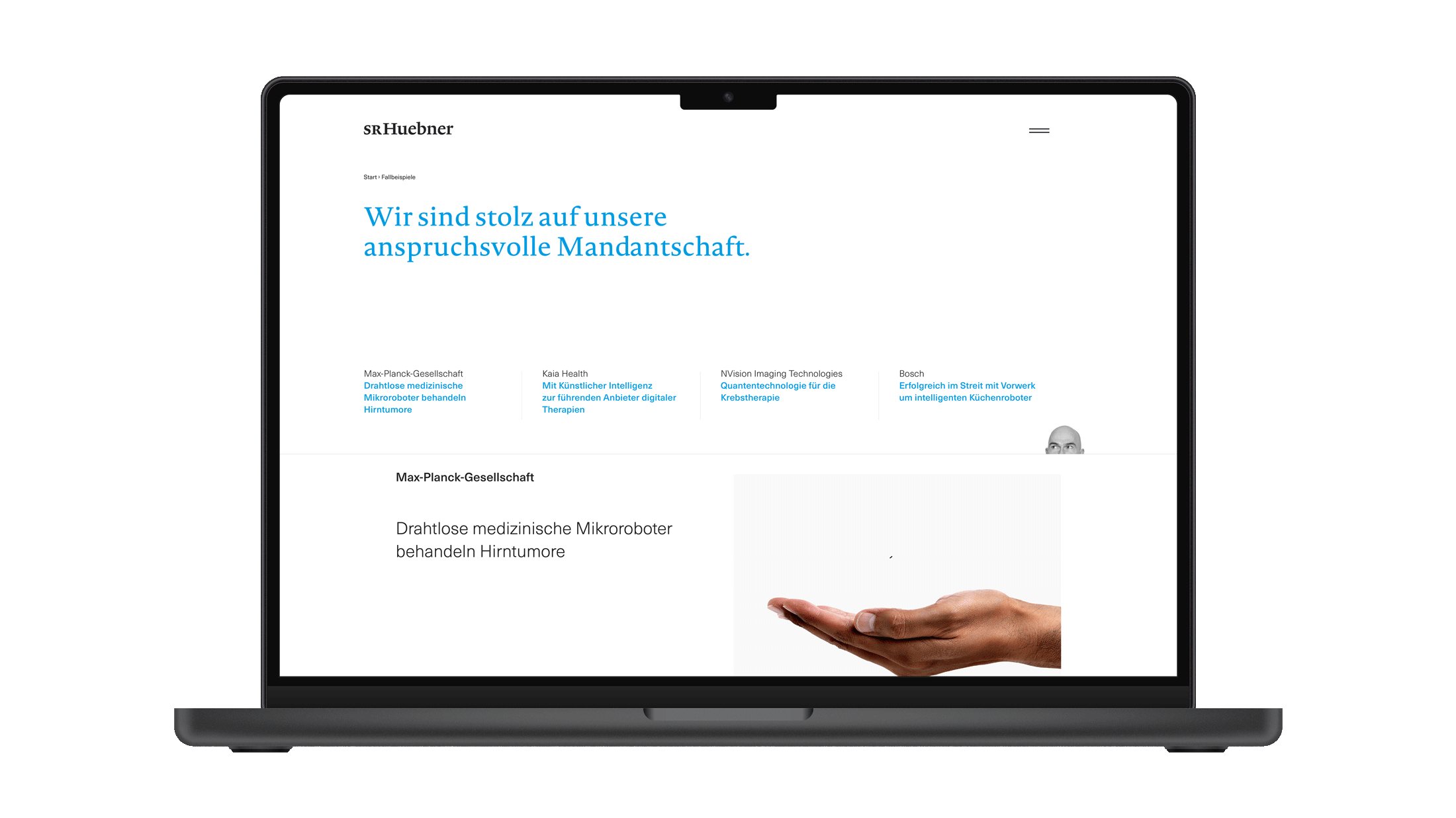 Corporate website relaunch of Munich-based patent law firm SR Huebner, German Design Award Winner 2024